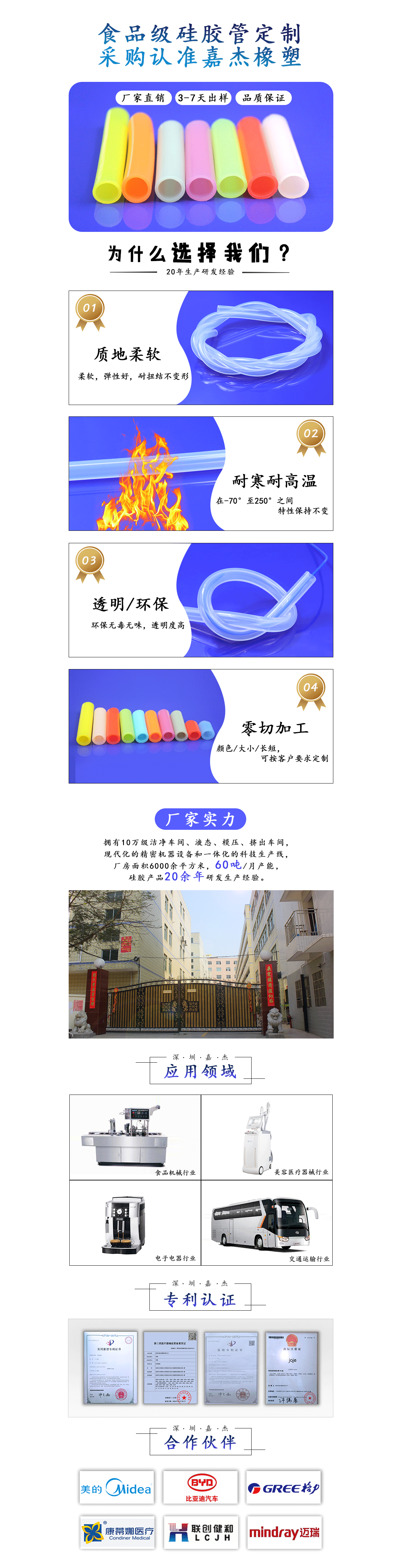 可過FDA,LFGB等認證,可醫用,使用進口硅膠原料制作,透明度高,回彈性好,耐扭結,安全環保,無異味.